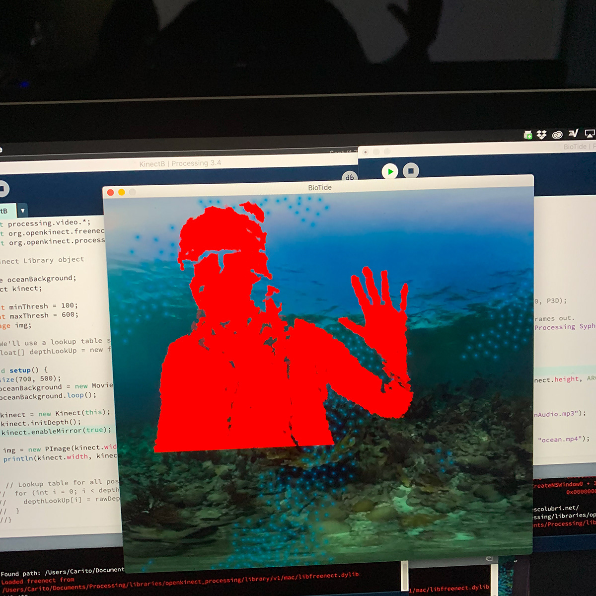 There is a plexiglass half orb suspended on the wall. Through MadMapper, two videos are projected on the wall, one of outer space, and a smaller one of a bioluminescent ocean on top of the orb. The latter is a processing sketch, where the code dictates the movement of the bioluminescent particles floating on top of the ocean. The sketch also communicates with a kinect through an open kinect library, and MadMapper through a syphon library. The function of the kinect is to register a person getting up close and to project their silhouette onto the plexiglass orb by communicating this to MadMapper and the projector. The sketch also uses video and sound libraries in order to be able to play the ocean video, as well as underwater sounds.